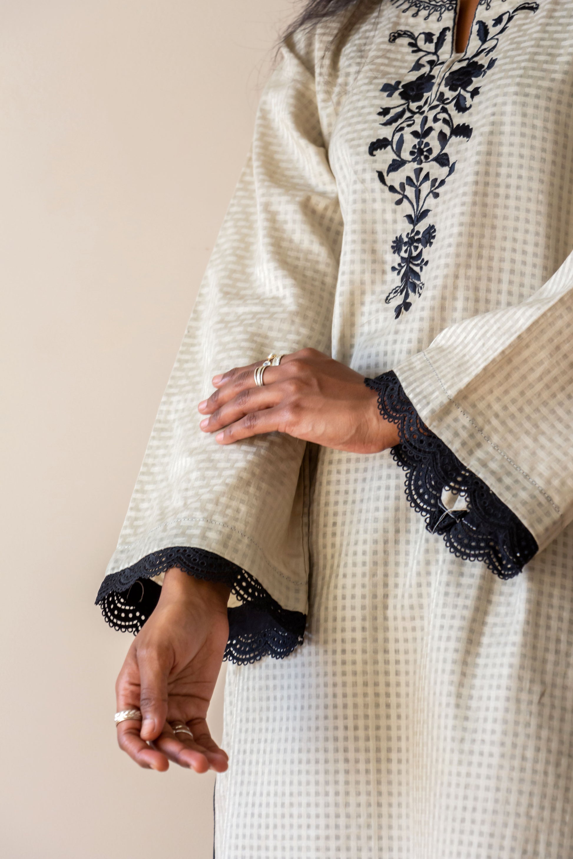 Textured cotton kameez with embroidered neck and scalloped lace finishing.
