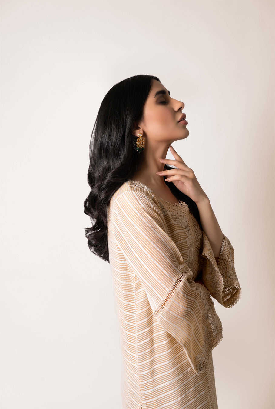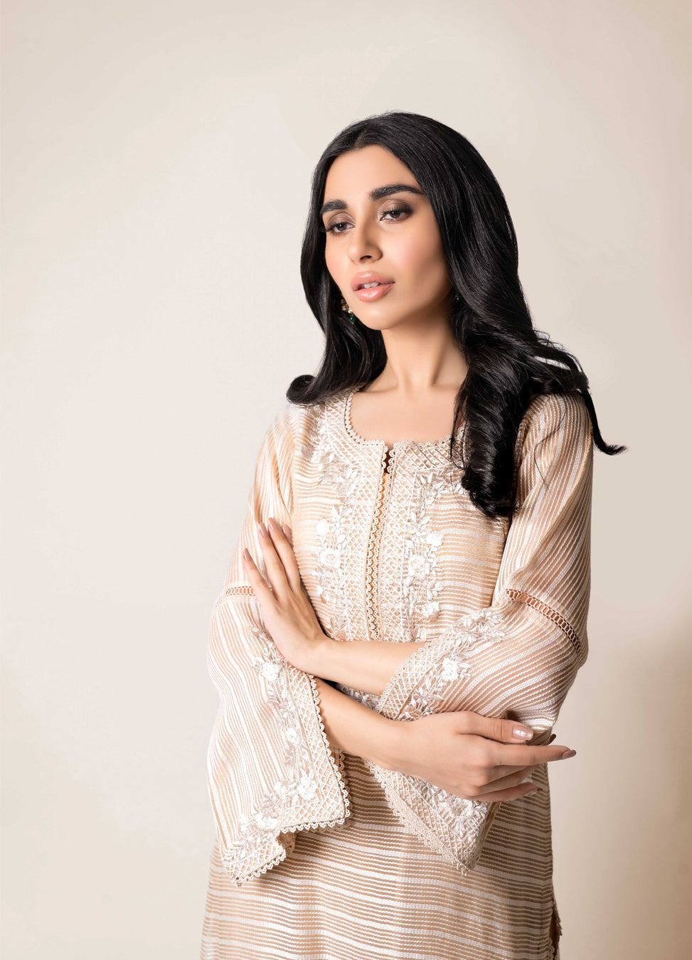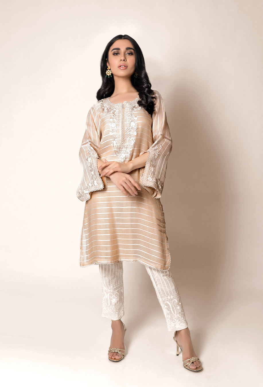 Dull gold mesuri net shirt with embroidery on neck and sleeves.