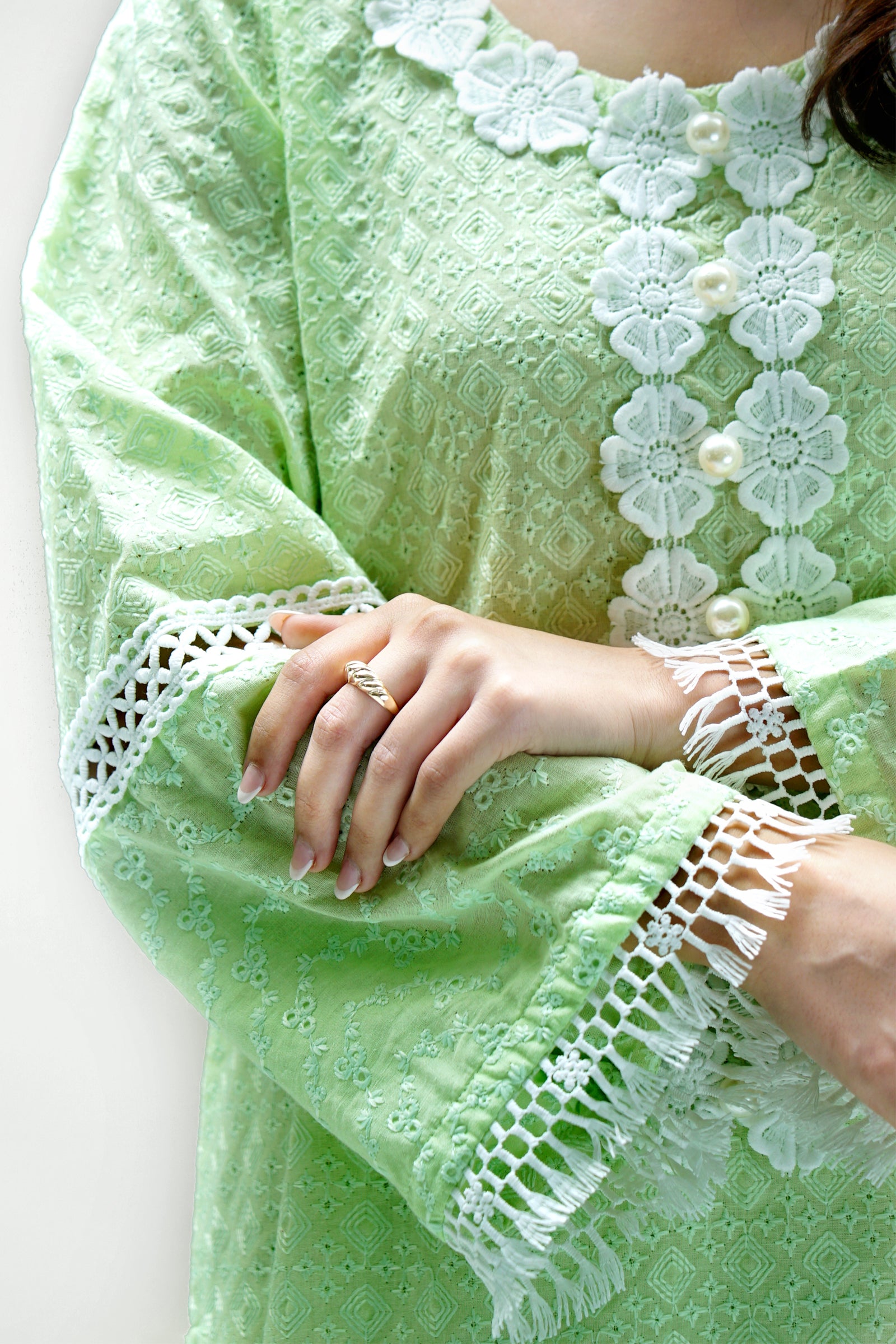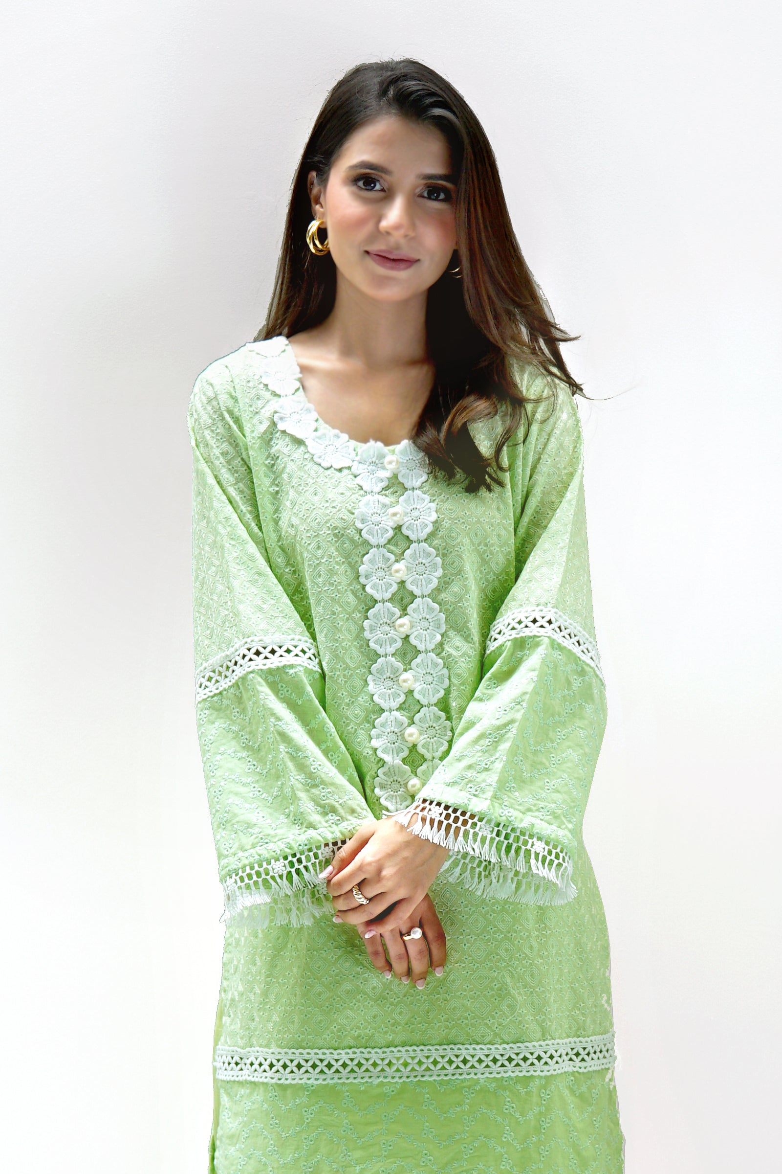 Pistachio green chicken kameez with lace detailing. Paired with cotton cigarette pants with lace finishing.