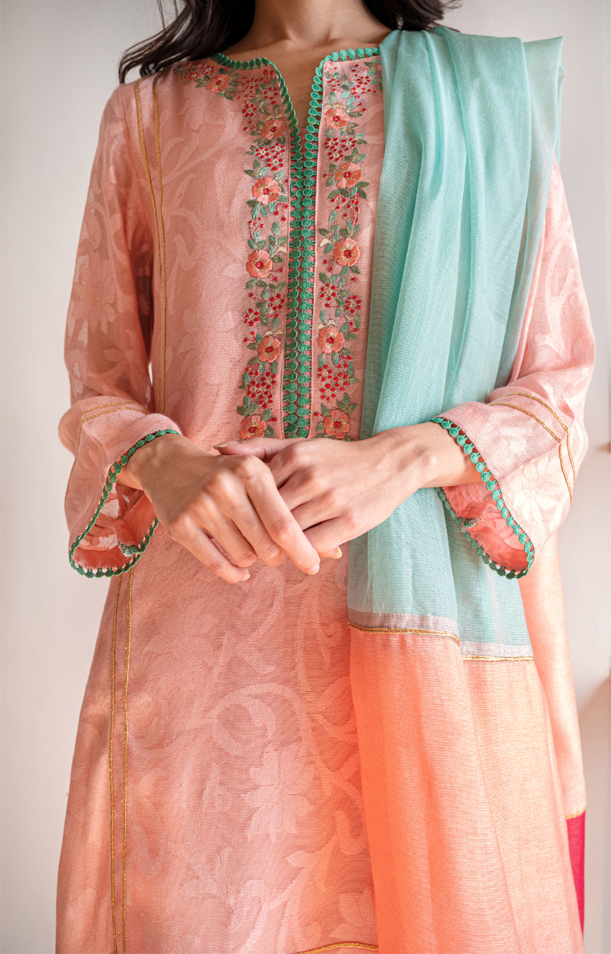 Peach cotton net kameez with embroidered neck and lace detailing. Paired with a cotton silk skinny shalwar and colour blocked dupatta.