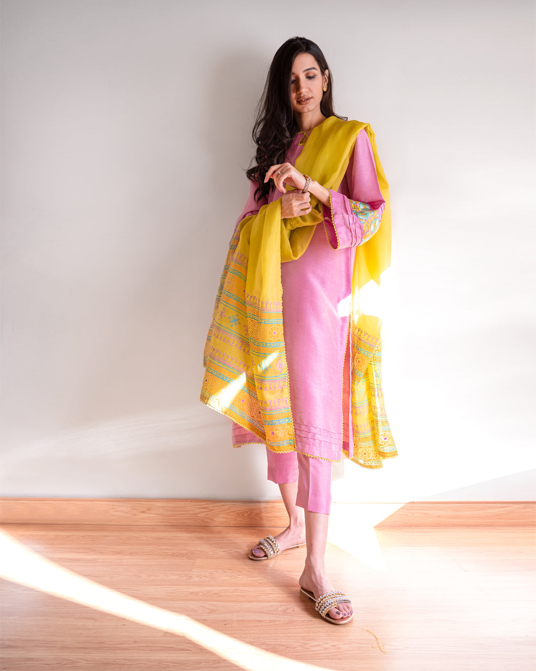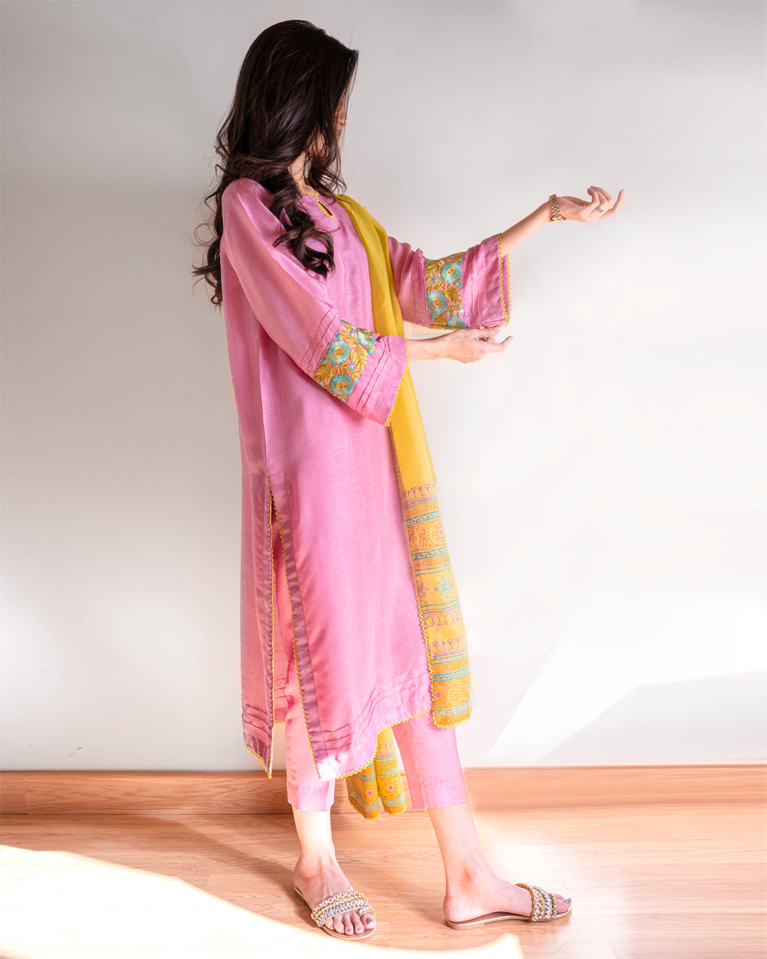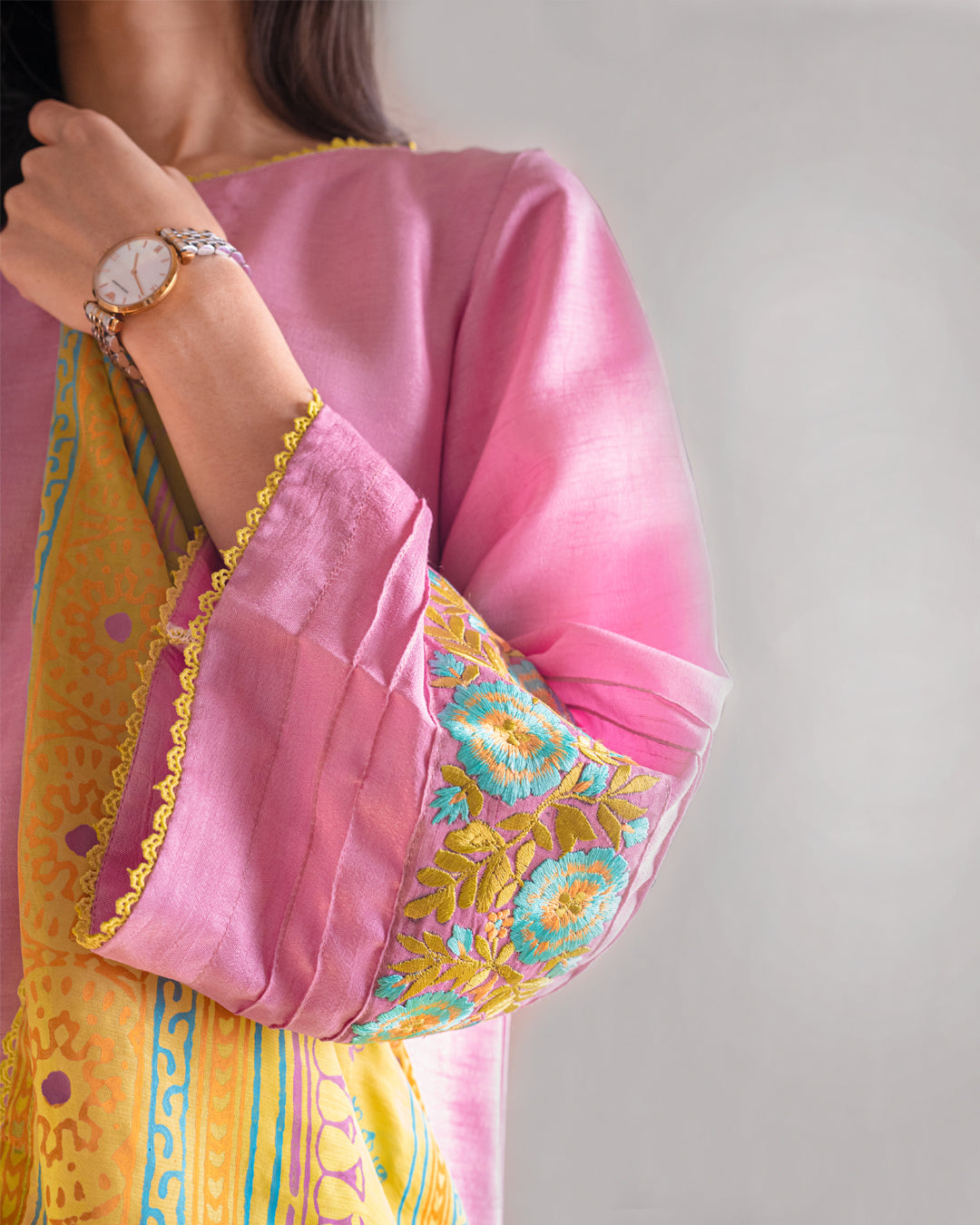 Pink silk kameez with embroidered sleeves paired with silk pants and a block printed silk dupatta.
